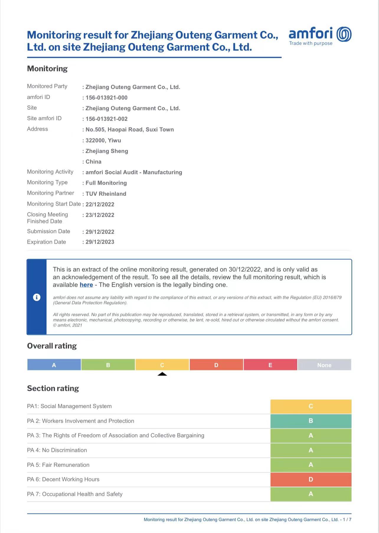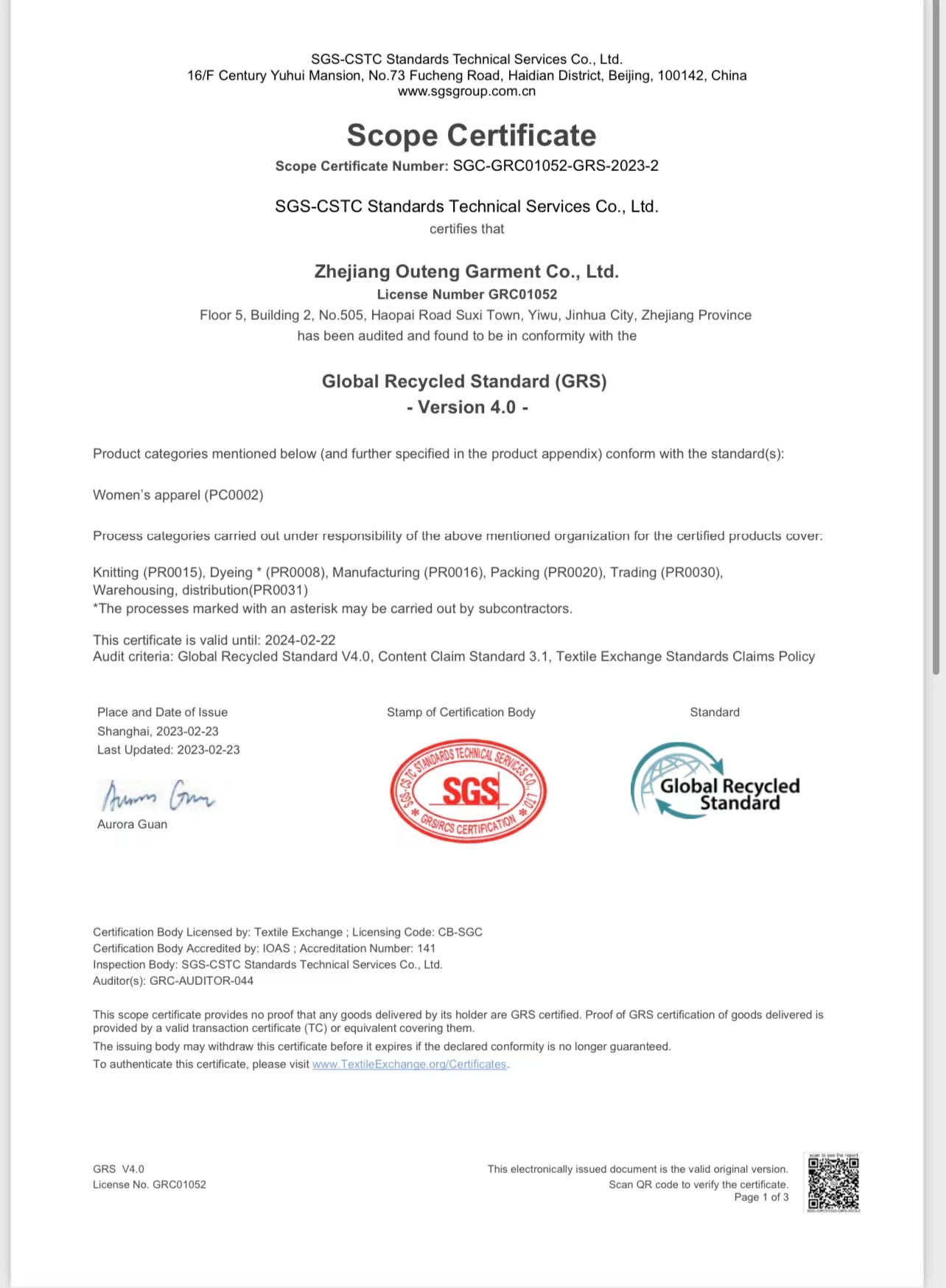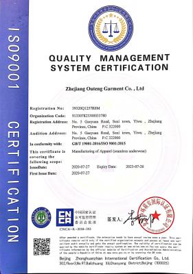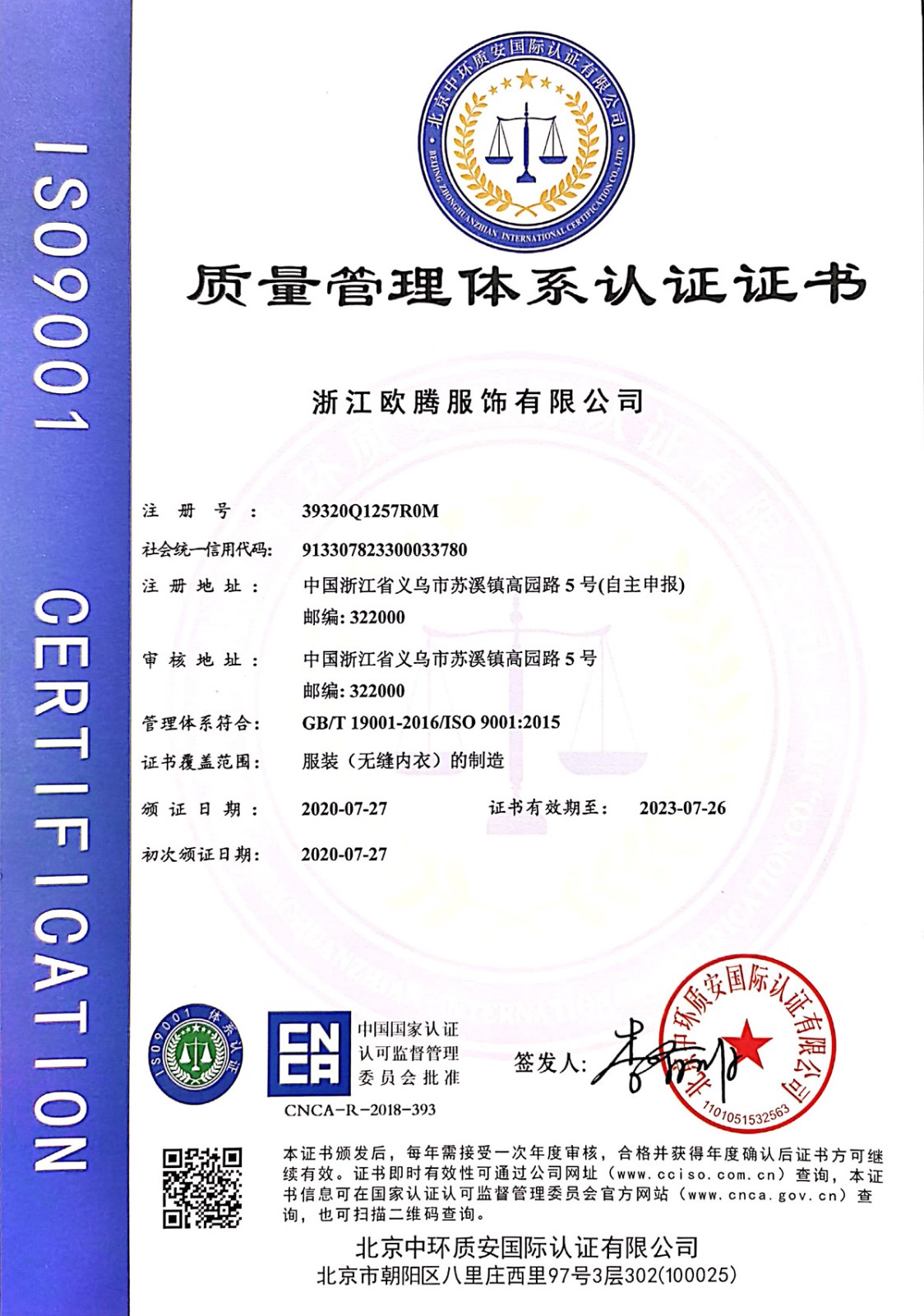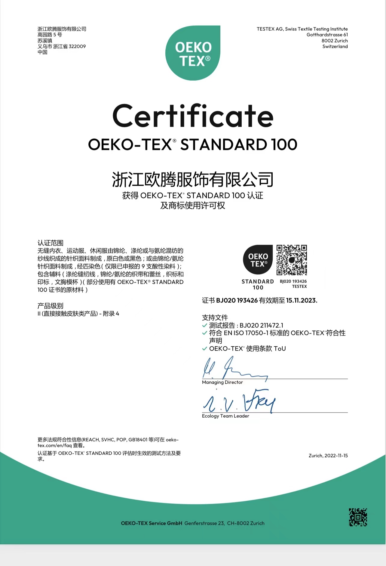 浙江歐騰服飾有限公司位于世界小商品之都-義烏。創(chuàng)立于2015年,是一家專業(yè)生產(chǎn)無(wú)縫針織運(yùn)動(dòng)服飾和內(nèi)衣的工貿(mào)一體企業(yè),擁有自主出口權(quán)。 工廠的占地面積約16000平方米 ,引進(jìn)了大型圣東尼、高騰等多種先進(jìn)的制衣設(shè)備300余臺(tái)。月產(chǎn)能可達(dá)90萬(wàn)件。 歐騰服飾每年投入近百萬(wàn)資金打樣開發(fā)新產(chǎn)品,有著一支高素質(zhì)設(shè)計(jì)、技術(shù)員工隊(duì)伍。工廠先后通過(guò)了ISO 9001質(zhì)量管理體系認(rèn)證、BSCI認(rèn)證、GRS認(rèn)證、OEKO-TEX國(guó)際生態(tài)紡織品認(rèn)證等多項(xiàng)專利檢測(cè)報(bào)告。可提供OEM&ODM服務(wù)。歐騰服飾以一套完整、科學(xué)的質(zhì)量管理體系,生產(chǎn)的服裝從原材料紗線到成衣,質(zhì)量完全能夠滿足國(guó)內(nèi)、國(guó)際質(zhì)量要求。獲得了客戶一致好評(píng)。工廠先后獲得省科技型企業(yè)、國(guó)家高新企業(yè)、義烏市誠(chéng)信講信用單位、規(guī)上企業(yè)、信用AAA級(jí)等榮譽(yù)。